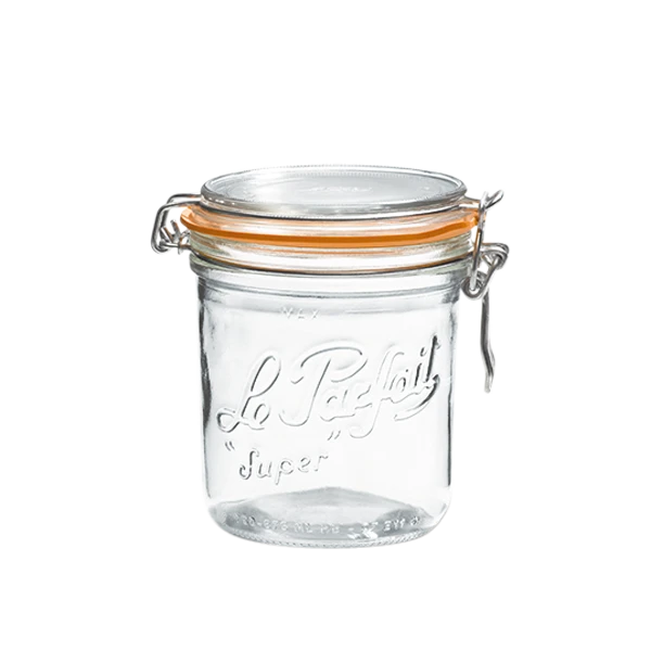 Le Parfait Super Terrine jars feature an easy-to-use hinged, wire bail lid. They have straight sides that taper slightly at the bottom and a large opening that allows for easy filling.
