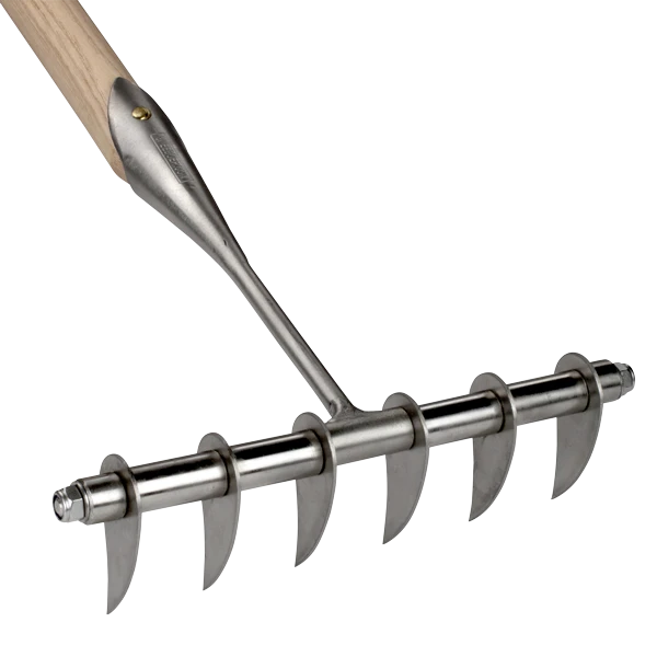 This rake is used for removing stubborn lawn moss, and cutting grass roots to stimulate extra root growth.