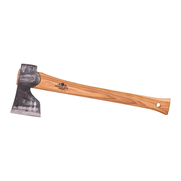 This axe has a long, thin and straight edge with a straight bevel face and a narrower poll, giving an even cutting surface for great carving. The forged inward curve from the heel to the lip of the head allows your hand to grip almost straight above the centre of the cutting edge, which is important when your work requires stability and precision. The handle is straight to suit all grips. Its flat, straight shape makes this axe suitable for work in dry wood.