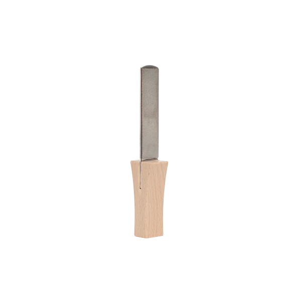 This is a straight, fine-grain diamond file with two faces and a small wooden handle. The handle is thicker near the file blade to give a good grip. The file has a coarse side and a fine side. Sharpen with the coarse side first, then finish off with the fine side. The file is normally used with water but can be used dry.
