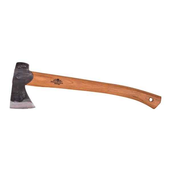 This axe is specially made for the hunter and is ideal for the butchery of your catch in the field, as well as felling small trees and limbing branches. The axe has a rounded smooth poll for use when skinning an animal. (An axe with an ordinary straight poll with sharper corners can easily damage the hide.) The end of the handle has circular grooves which provide a steady grip, even if your hands are wet or sticky.