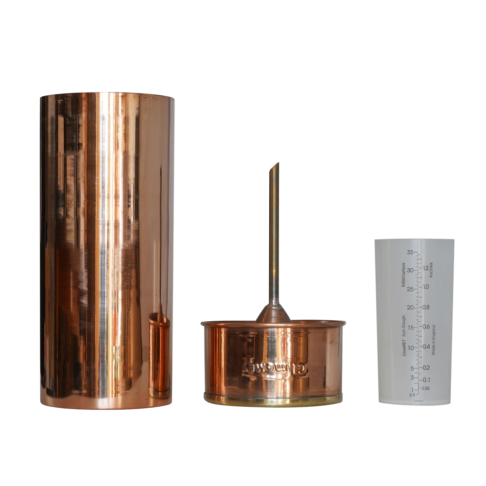 The rain gauge consists of a copper and brass funnel, copper collector and calibrated plastic measure. The rain is collected and funnelled into the inner plastic measure from which the contents can be measured. Any additional rainfall is collected in the large copper body of the rain gauge and can be measured by pouring it into the supplied measuring jar.