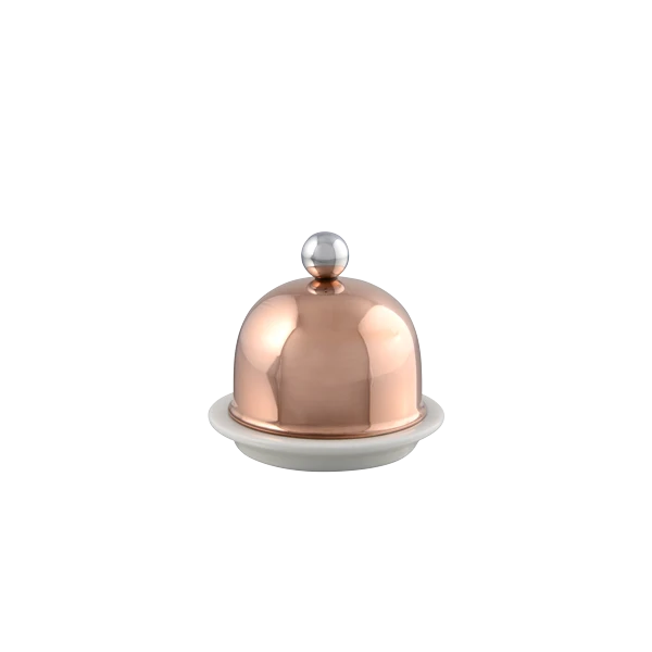 This butter dish signifies luxury with its beautiful copper dome that sits atop a round porcelain base. The perfect accompaniment for any breakfast or afternoon tea!