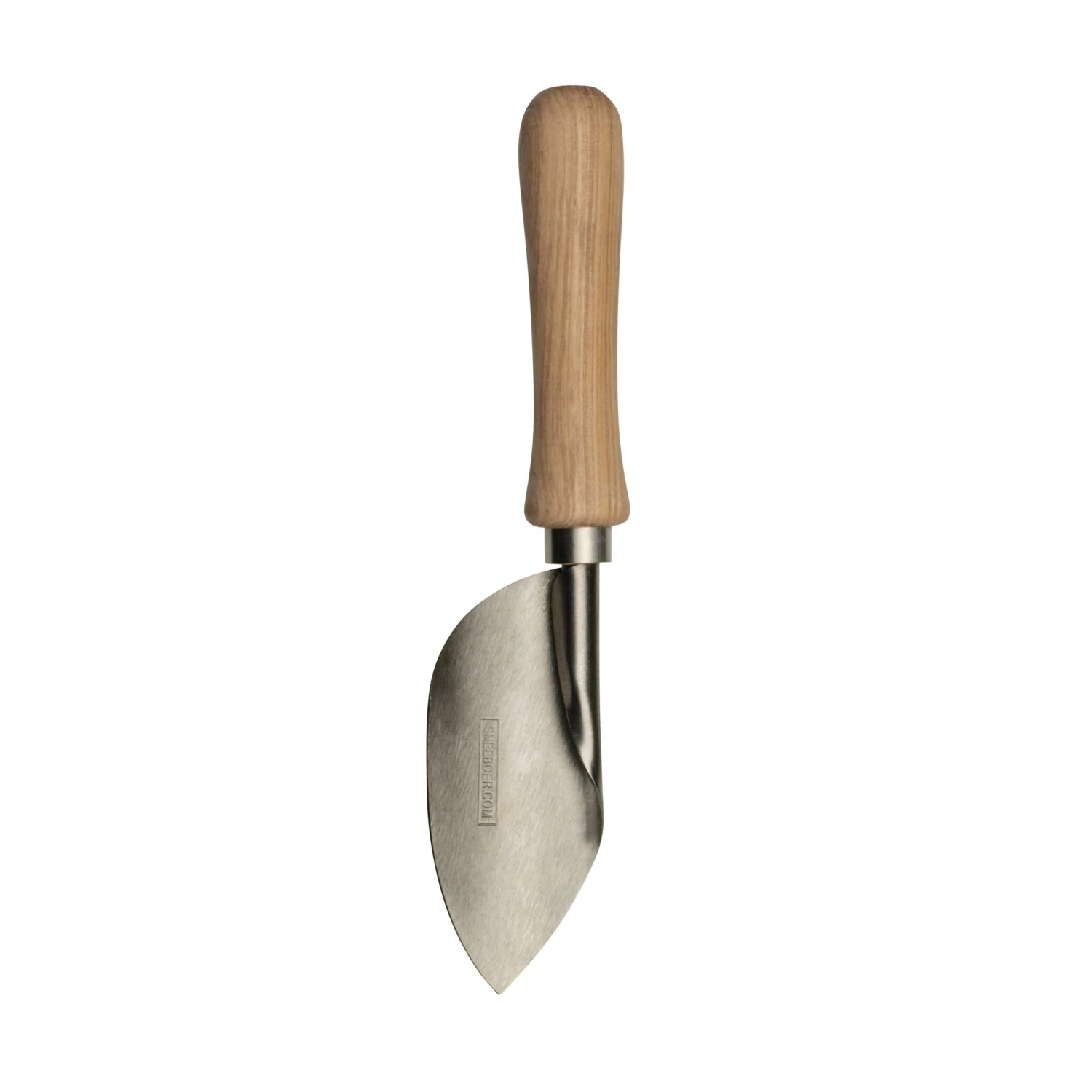 This specially designed tool for potting is a pleasure to use. The shape of the blade allows the user to scoop up material with precision and deposit it in a container of any size without spilling. The curve of the blade also makes the trowel ideal for removing roots that have grown into the porous walls of pottery.
