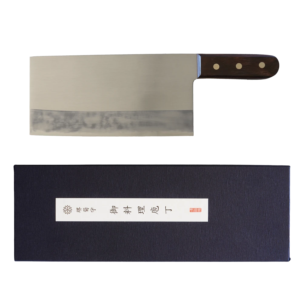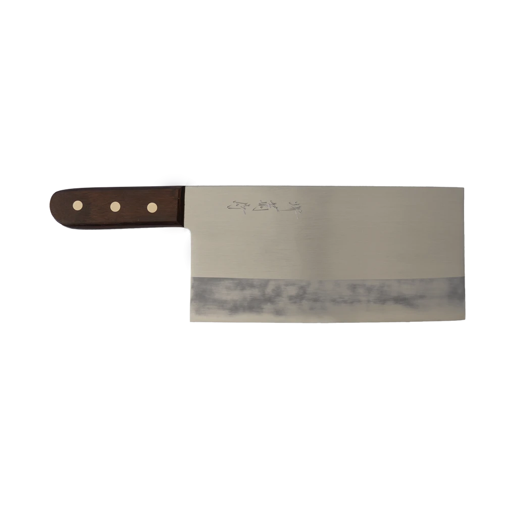 The Chinese Cleaver or ‘Chuckabocho’ as it is known in Japan is used for slicing, chopping and mincing vegetables, fruit and small-boned protein. It is not to be confused with a butchering cleaver and, as such, should not be used to chop through large bones. It has a sharp, straight double bevel edge and is charcterised by its extremely tall, large and rectangular-shaped blade.