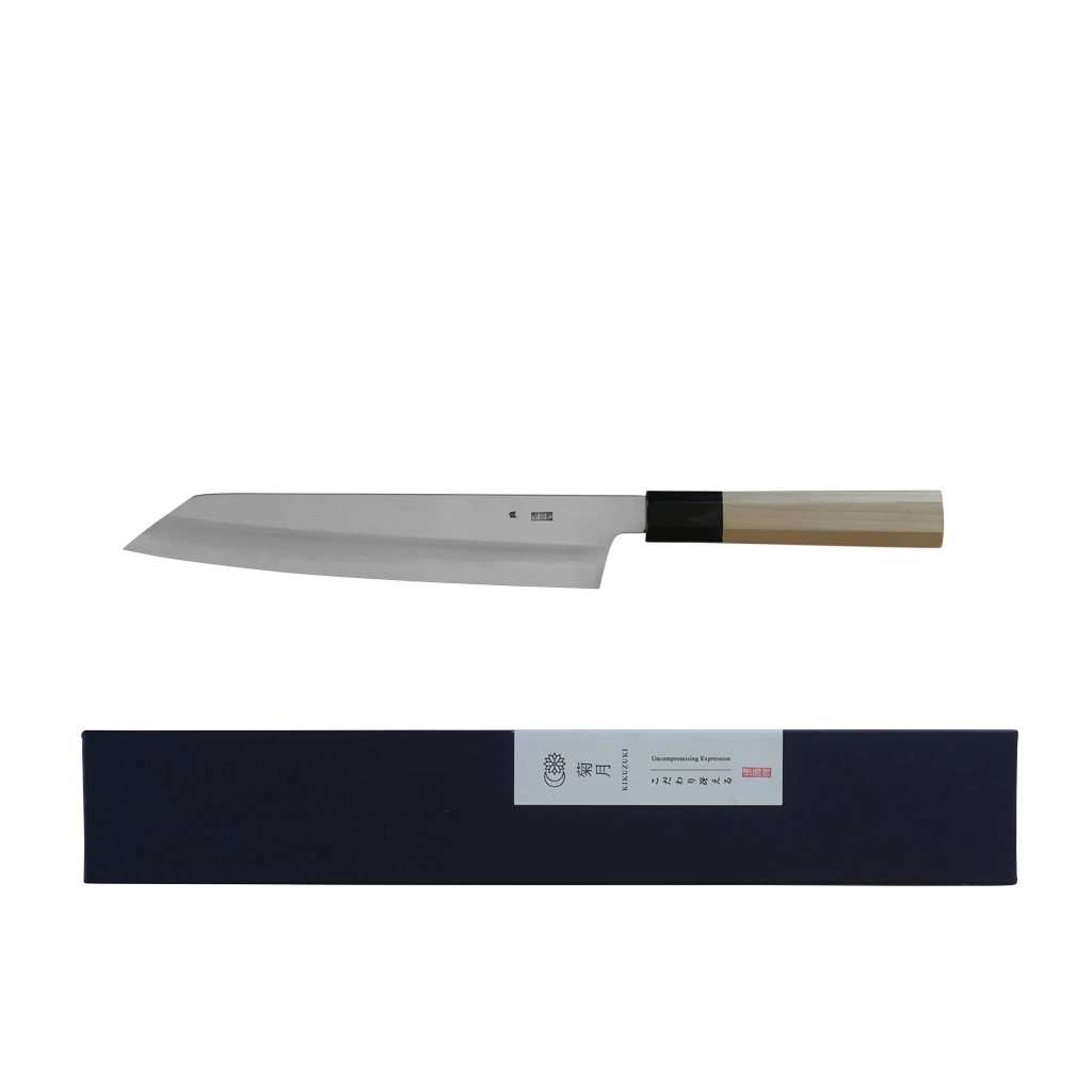 Gyuto knives are a Japanese-style Western chef’s knife which translates to ‘cow sword’ or ‘beef knife’. They are primarily used for slicing meat and larger ingredients. The Gyuto is the heart of any knife range due to its versatility.