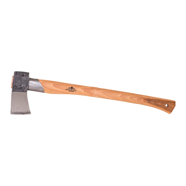The Small Splitting Axe can be used for cutting medium-sized firewood. It is forged and ground to a concave, quite thin blade at the bit. It cuts quickly and easily into the wood and then effectively splits it as the broader section pushes apart the wood. The handle has a protective steel collar below the head and circular grooves towards the end for an extra firm grip.