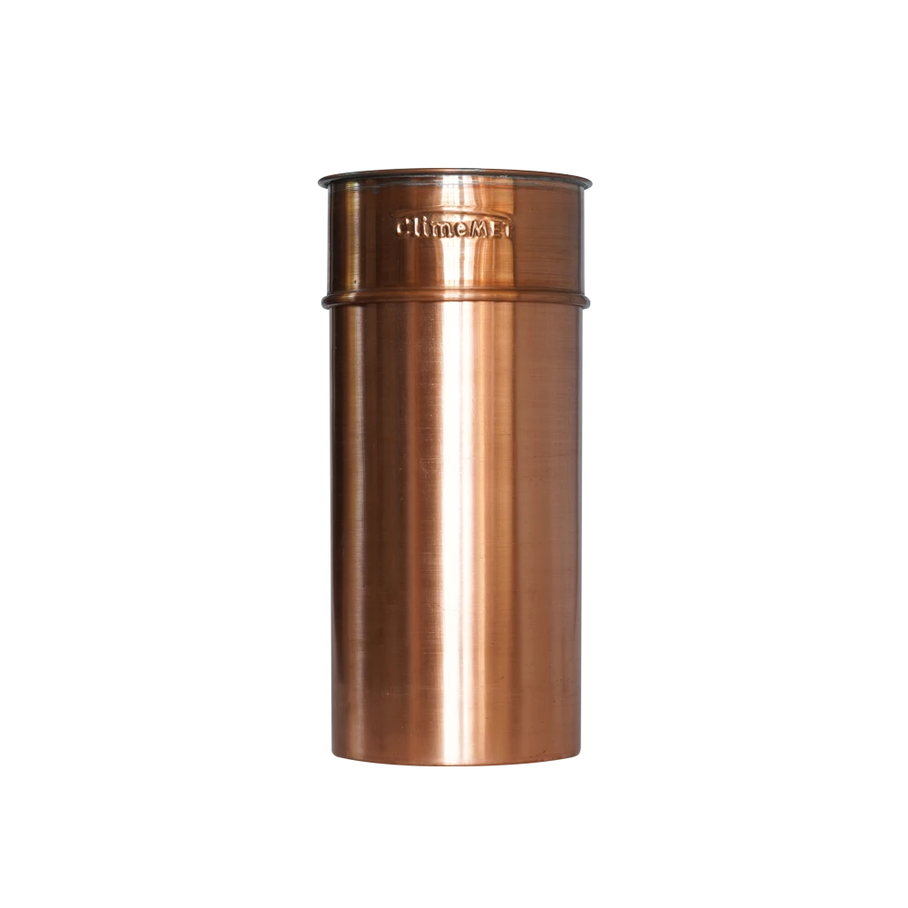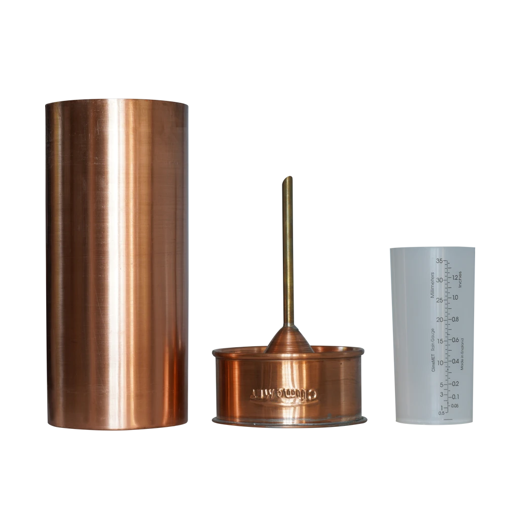 The rain gauge consists of a copper and brass funnel, copper collector and calibrated plastic measure. The rain is collected and funnelled into the inner plastic measure from which the contents can be measured. Any additional rainfall is collected in the large copper body of the rain gauge and can be measured by pouring it into the supplied measuring jar.